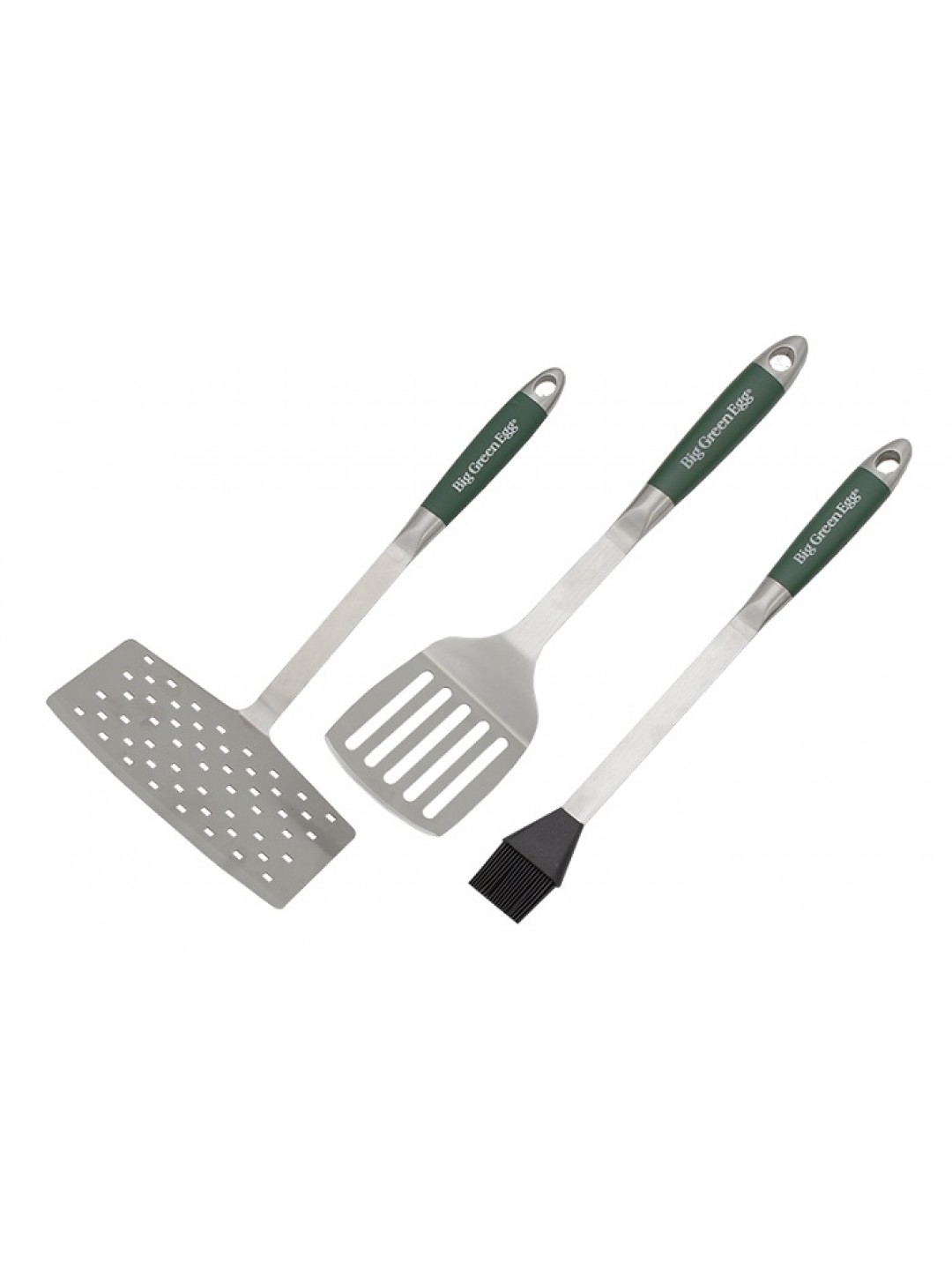 Набор инструментов для гриля Big Green Egg, включающий три предмета: лопатку, широкую лопатку и кисточку.