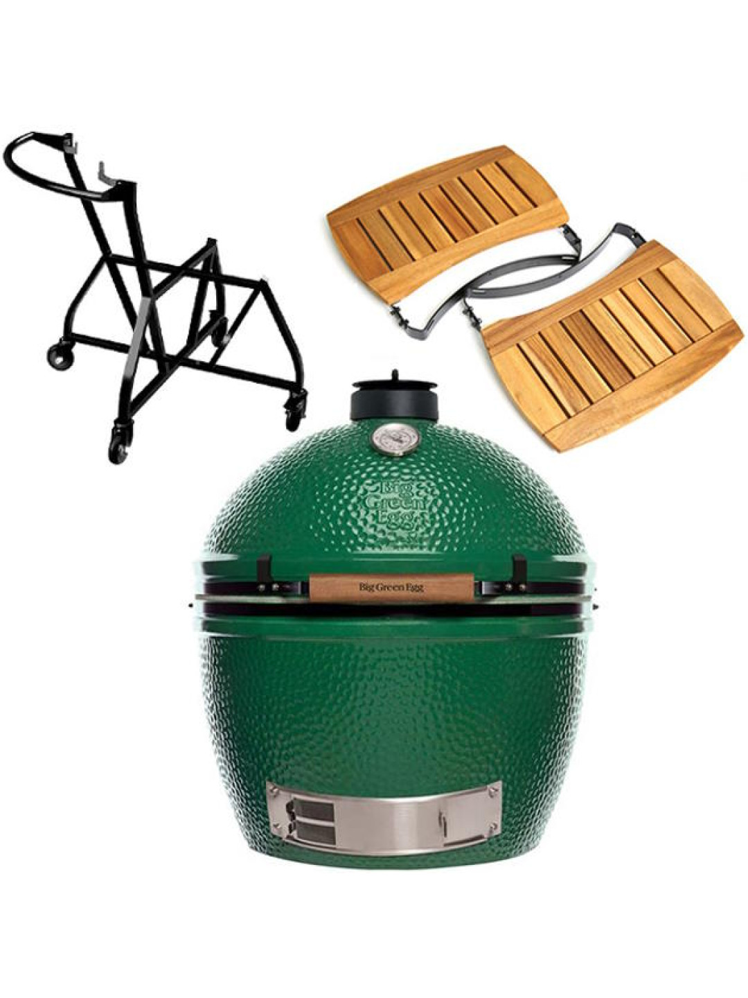 До складу комплект Big Green Egg XL входить: гриль Big Green Egg XL 117649, гніздо на колесах 121158 та розкладні бічні столики з дерева 121134, решітка для гриля 121226.